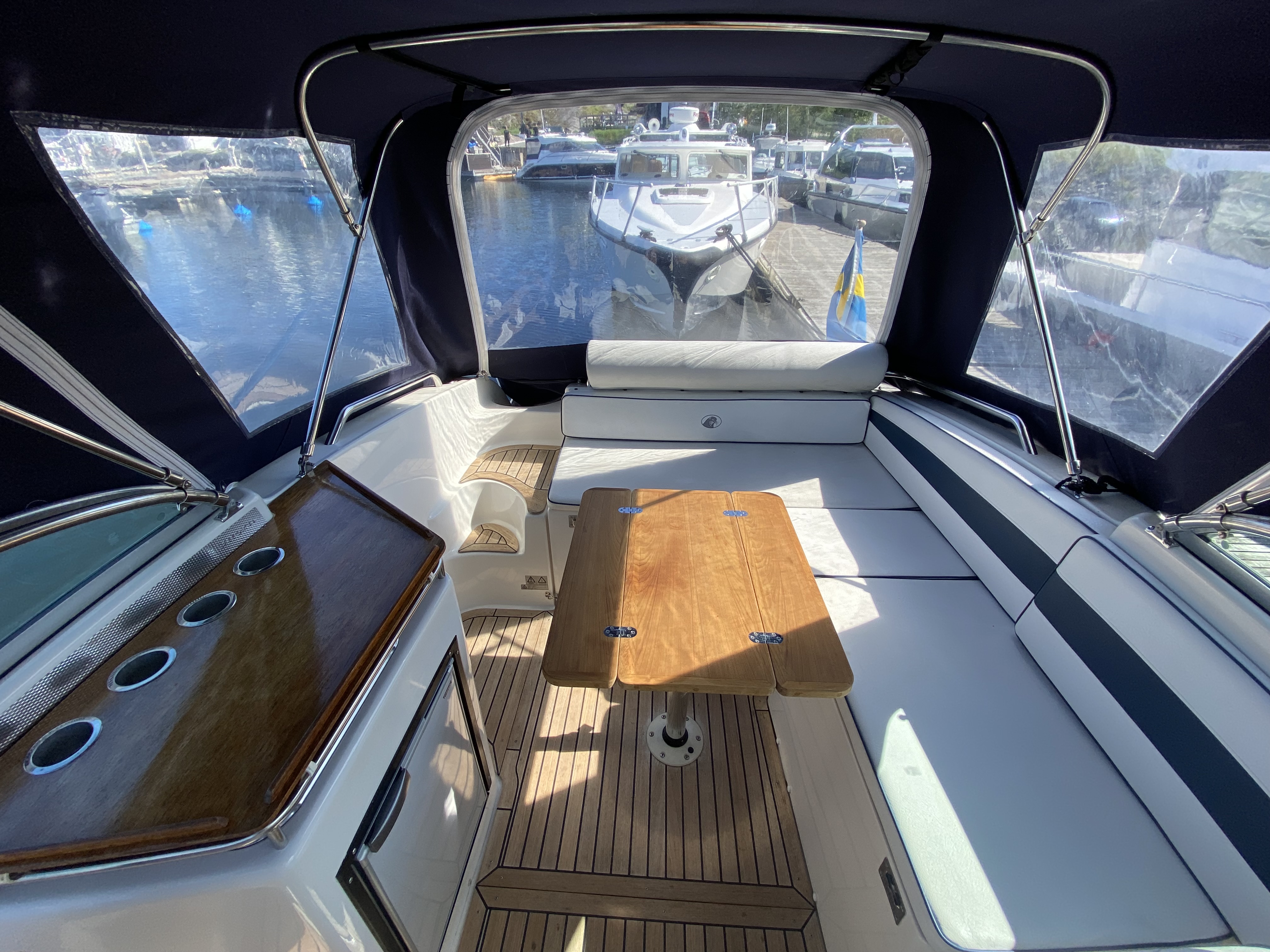 Utrustad med: GPS Raymarine 7s (2020), Smartcraft instrument, nytt kapell (2020), Origo spritkök (2019), kyl (2019), diskho med färskvatten, kemtoa, teakdurk, teakbord, solbäddsats m.m.